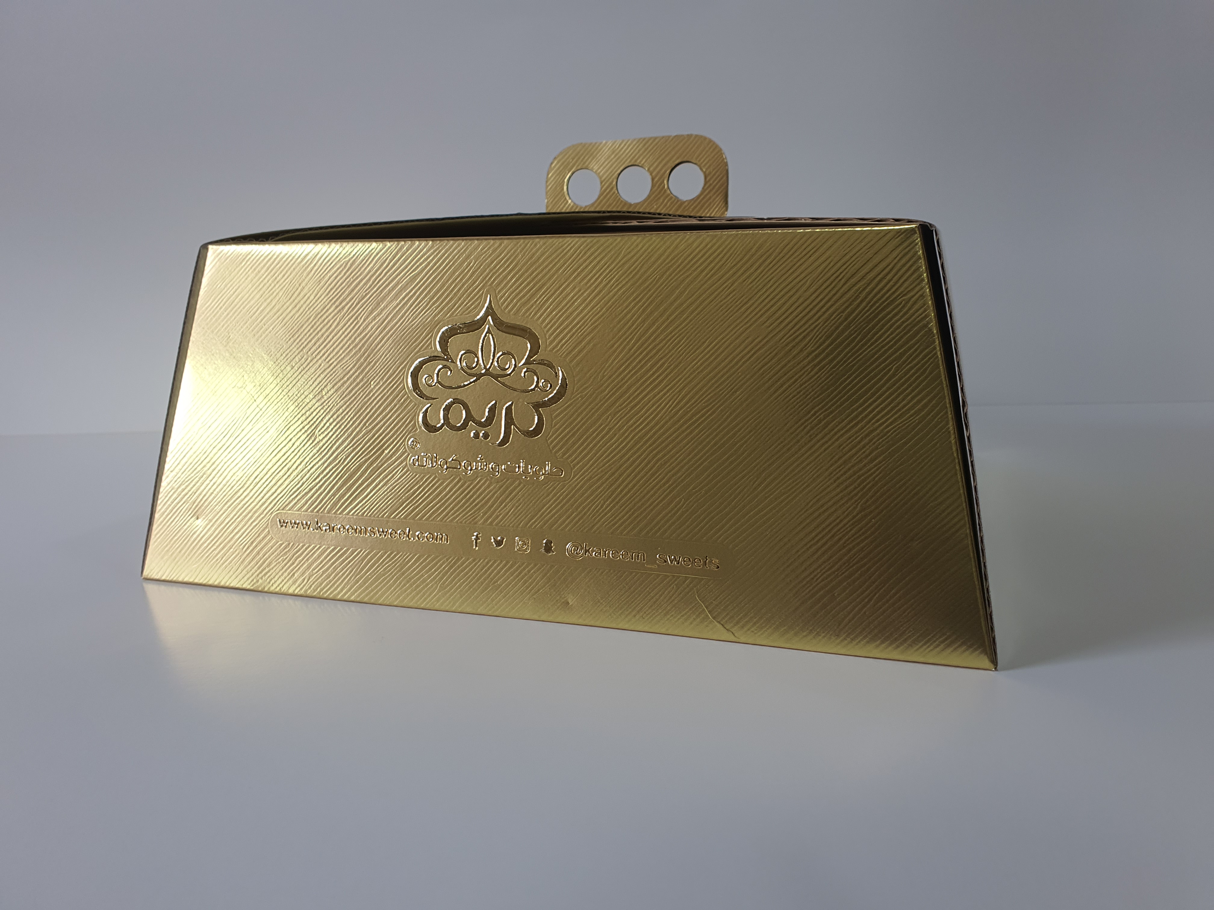 | Why this : | This premium sweet carry box features a luxurious gold metallic finish with a subtle diagonal textured pattern, offering an eye-catching and elegant presentation for high-end confectionery items. The box includes embossed branding and gold foil accents that enhance its premium look, making it ideal for festive gifting, special occasions, and luxury sweet assortments. Its strong laminated board provides excellent durability, while the integrated handle adds convenience for carrying sweets securely. The unique trapezoid shape gives it a distinctive premium identity, setting it apart from regular sweet boxes. Overall, the packaging delivers a refined, rich, and upscale aesthetic, perfect for brands wanting to create a memorable unboxing experience and elevate their product value. |