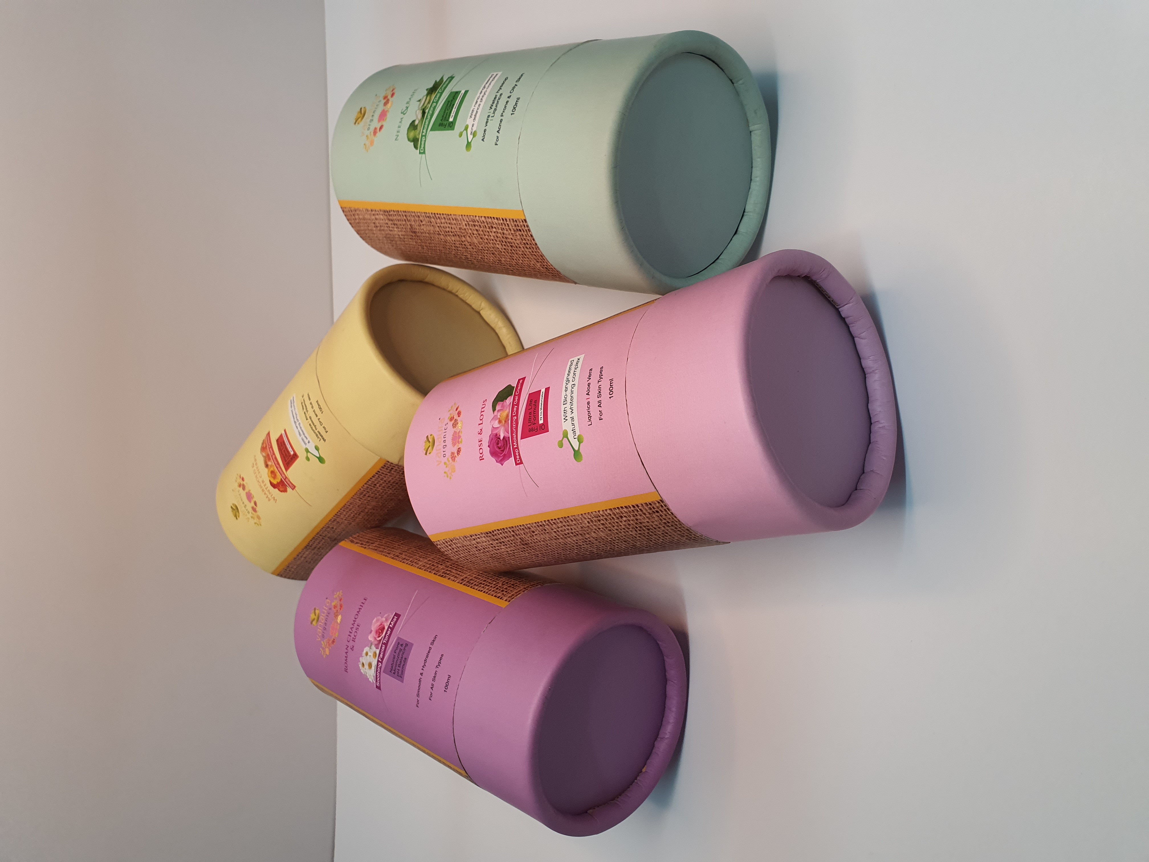 | Why this : | This cylindrical packaging features a premium eco-luxury design, combining smooth pastel-colored laminated paper with a textured jute-style wrap for an organic look. The two-part tube structure offers both protection and premium presentation, ideal for skincare or cosmetic products. It effectively communicates natural, eco-friendly, and elegant branding, making it perfect for organic beauty brands like Vanaura Organics. |