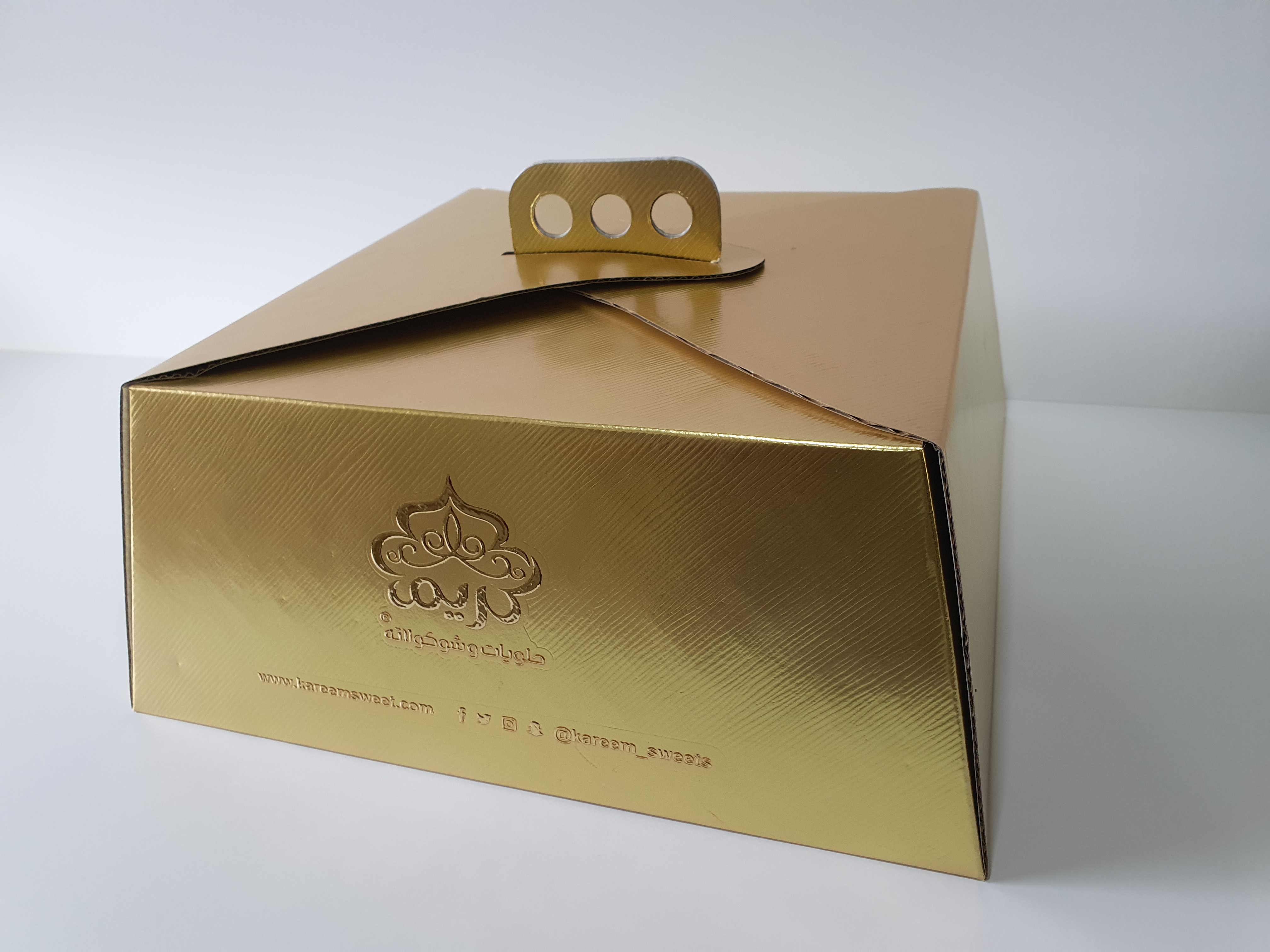 | Why this : | This premium sweet carry box features a luxurious gold metallic finish with a subtle diagonal textured pattern, offering an eye-catching and elegant presentation for high-end confectionery items. The box includes embossed branding and gold foil accents that enhance its premium look, making it ideal for festive gifting, special occasions, and luxury sweet assortments. Its strong laminated board provides excellent durability, while the integrated handle adds convenience for carrying sweets securely. The unique trapezoid shape gives it a distinctive premium identity, setting it apart from regular sweet boxes. Overall, the packaging delivers a refined, rich, and upscale aesthetic, perfect for brands wanting to create a memorable unboxing experience and elevate their product value. |