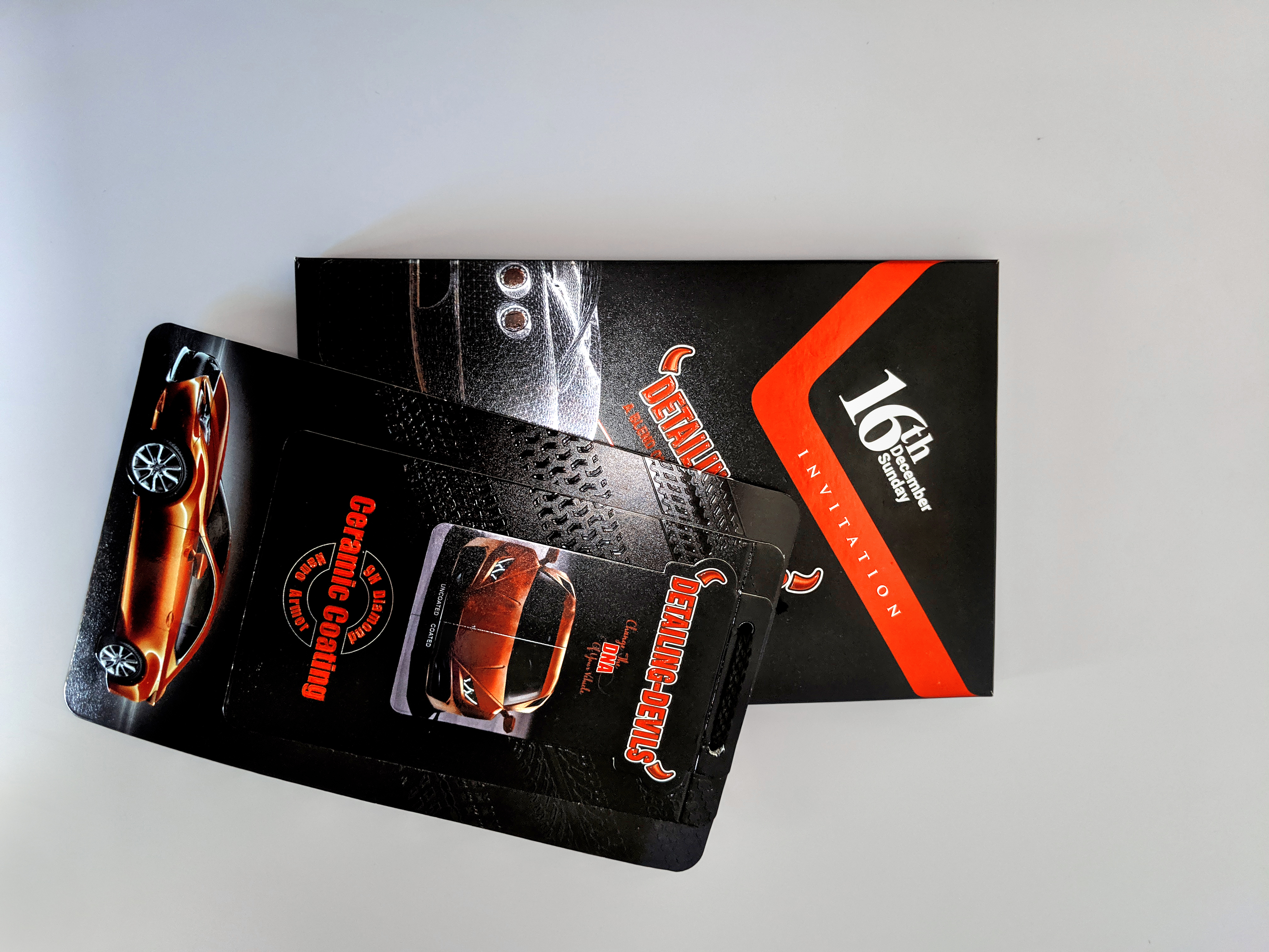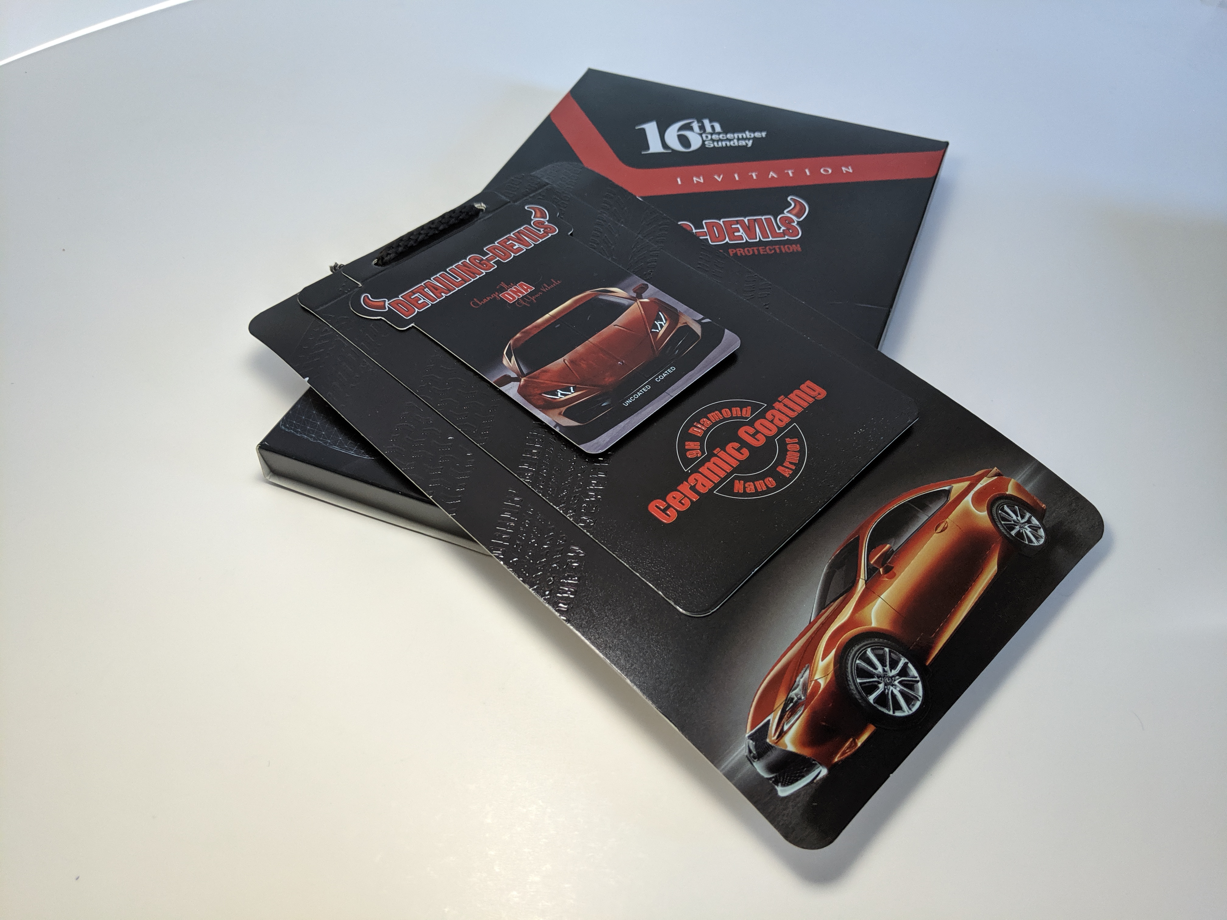 | Why this : | This premium invitation box for Detailing Devils’ 16th Anniversary Celebration is crafted with a durable black matte rigid board, featuring embossed textures and foil stamping in red and silver for a high-impact, luxurious finish. The design reflects the brand’s automotive theme, with glossy highlights and precision detailing that mirror the quality of their ceramic coating products. Ideal for corporate invitations, luxury event kits, and brand promotional boxes. |