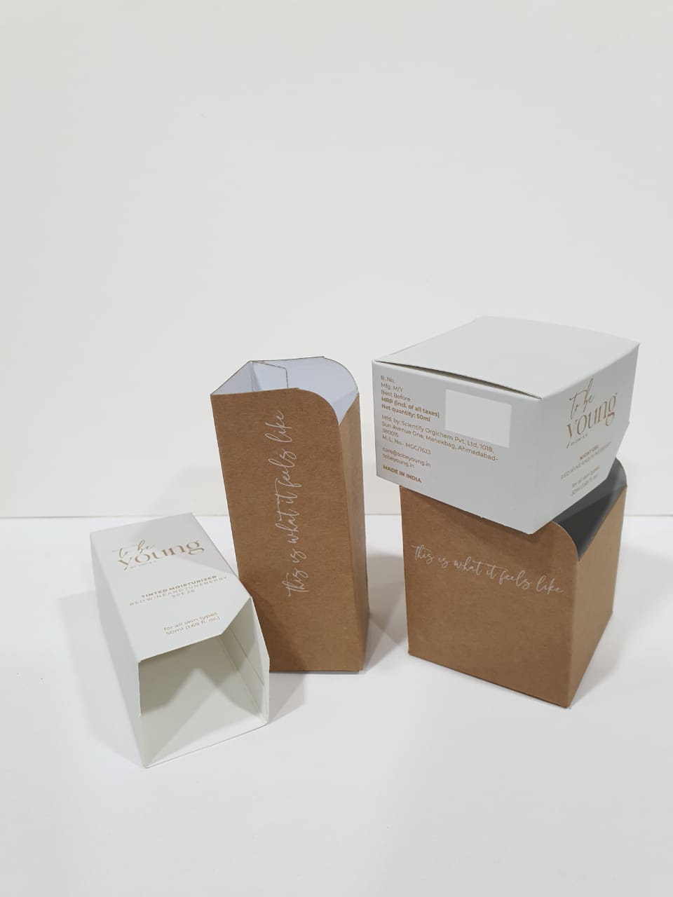 This packaging features a distinctive two-tone design combining a premium, smooth white card stock on the upper section with a natural, rustic kraft board on the base.